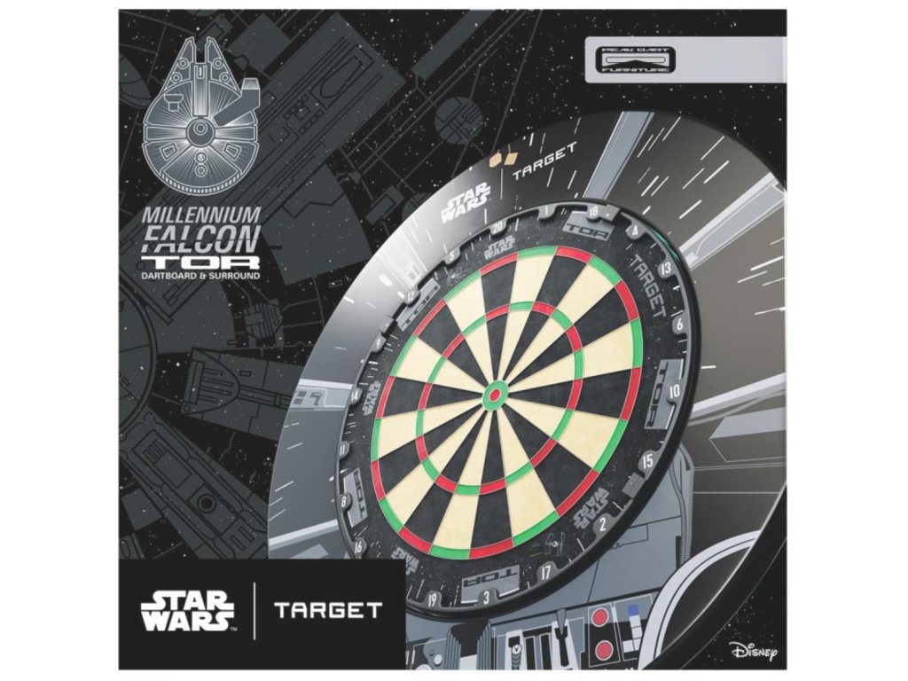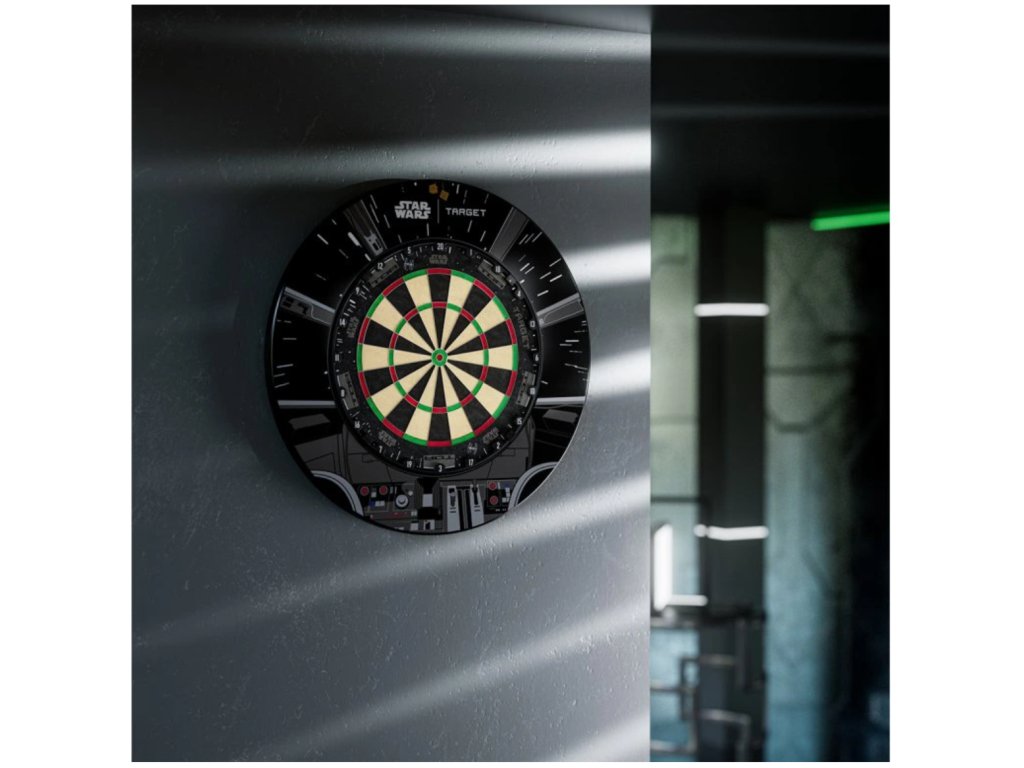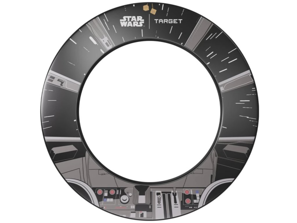 Součástí sady je tematický surround Millennium Falcon, inspirovaný kokpitem slavné lodi. Je vyroben z vysokohustotního polymeru se žebrovaným zadním profilem, který poskytuje aktivní ochranu stěn i šipek. Okruží se jednoduše nasazuje na terč, nevyžaduje vrtání ani šrouby a lze jej snadno sundat či znovu nasadit.