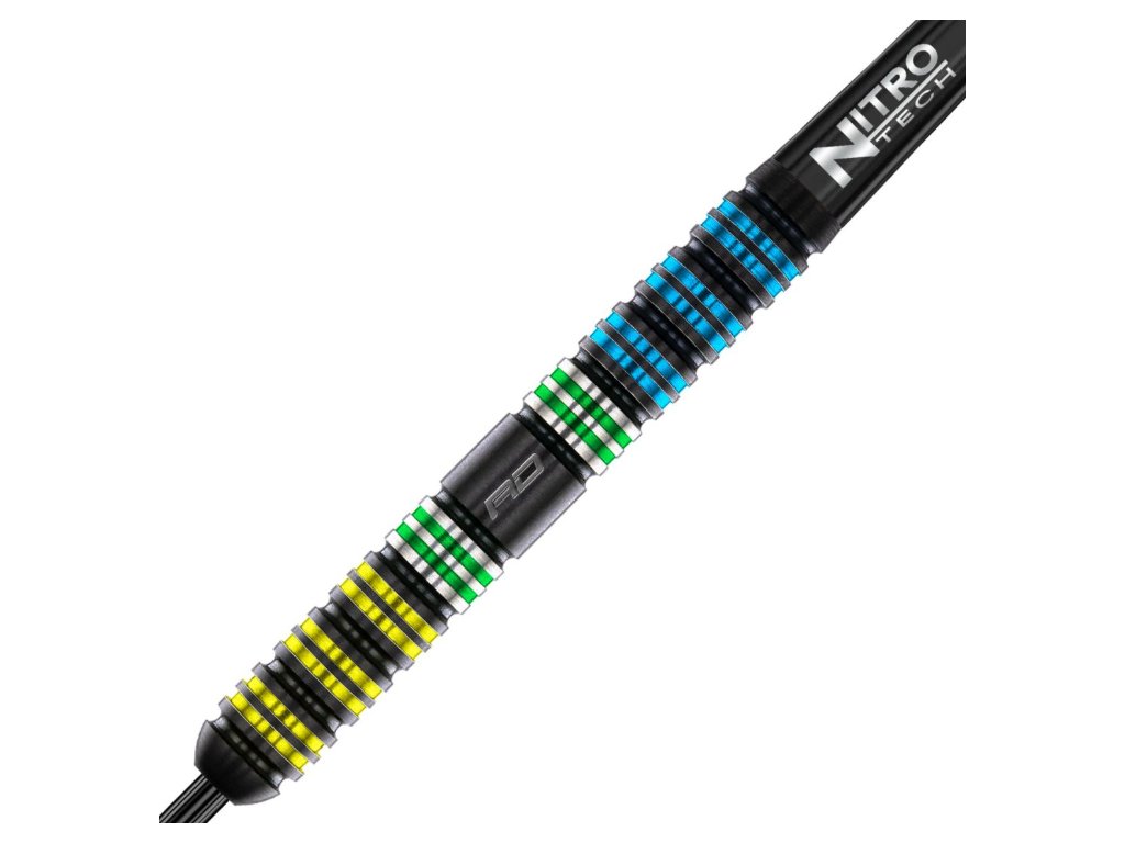 Černý barrel je zvýrazněn barevnými detaily – jemnými proužky v zářivé žluté, sytě zelené a výrazné modré barvě, které šipkám dodávají moderní a atraktivní vzhled. Povrch je navržen pro jistý a pohodlný grip, takže šipky skvěle sedí v ruce a umožňují přesnou hru i při delších zápasech.