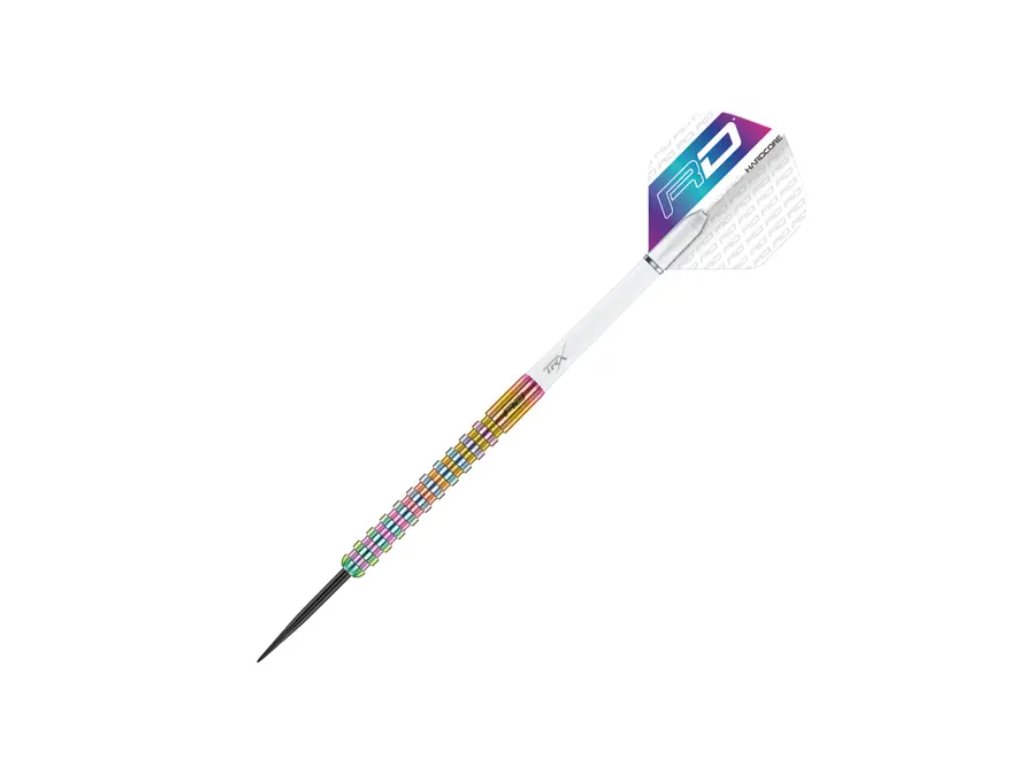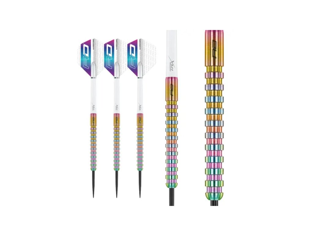 Delší rovný barel z 85% wolframu je proveden v duhových barvách a má hrubý, ostrý grip.