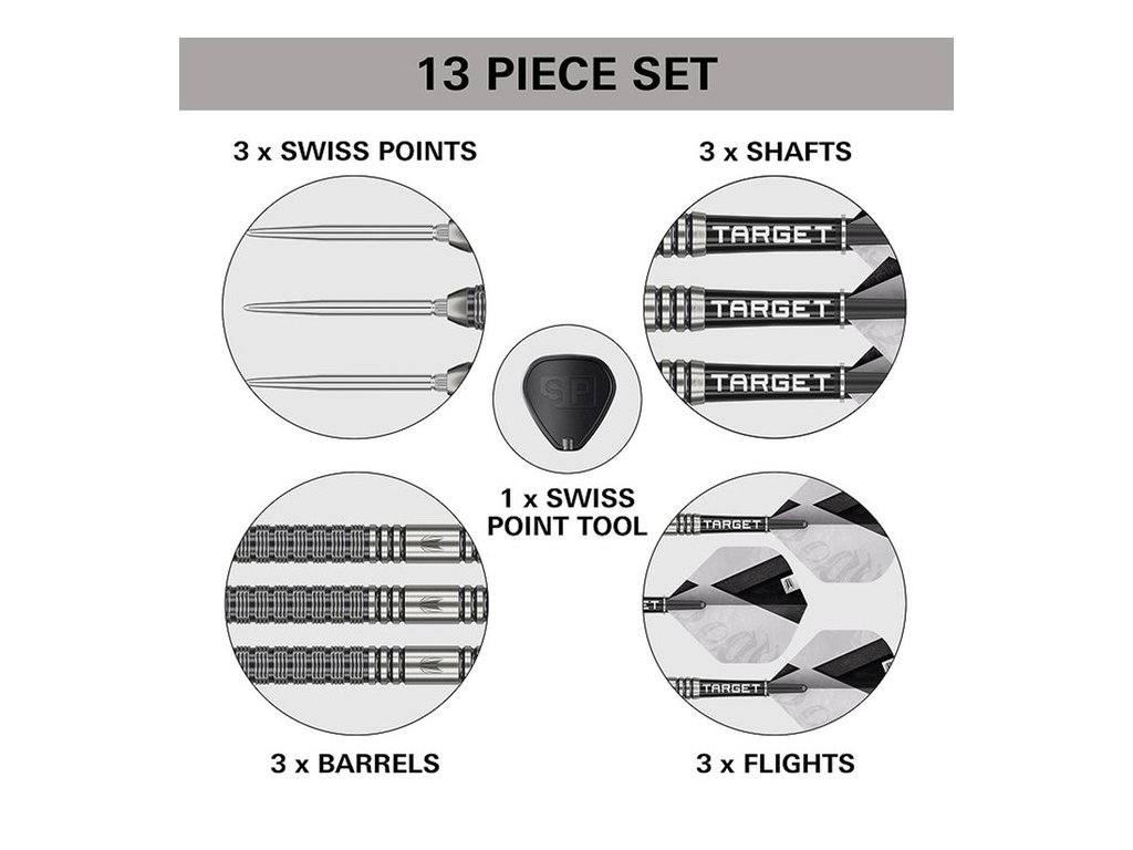 Kovové hroty šipek Swiss Point o délce 30 mm lze snadno a rychle vyměnit pomocí přiloženého klíče. Tato technologie zajišťuje pevné uchycení hrotu v těle šipky a zároveň umožňuje přizpůsobení stylu hry podle potřeby.