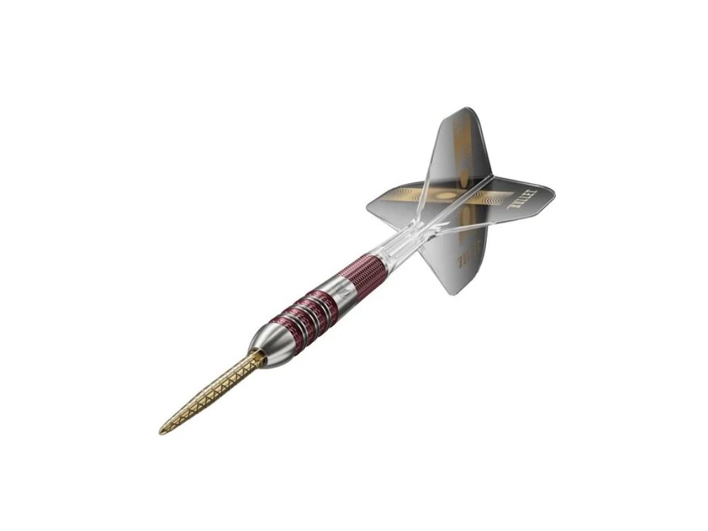 Zužující se tvar s precizně tvarovanou přední částí přechází do pečlivě zpracované gripové zóny, která je zvýrazněna výrazným červeným prstencem a detailními mikrořezy. Tento tvar je ideální pro hráče preferující přední úchop a nabízí perfektní rovnováhu mezi pohodlím a jistotou při hodu.