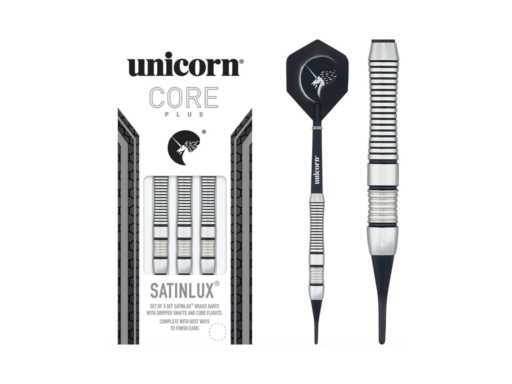 Stylové softové šipky značky Unicorn v moderním chromovém provedení Satinlux. Model Core Plus Win kombinuje precizní zpracování, výborný grip a perfektní vyvážení pro maximální kontrolu při hře.